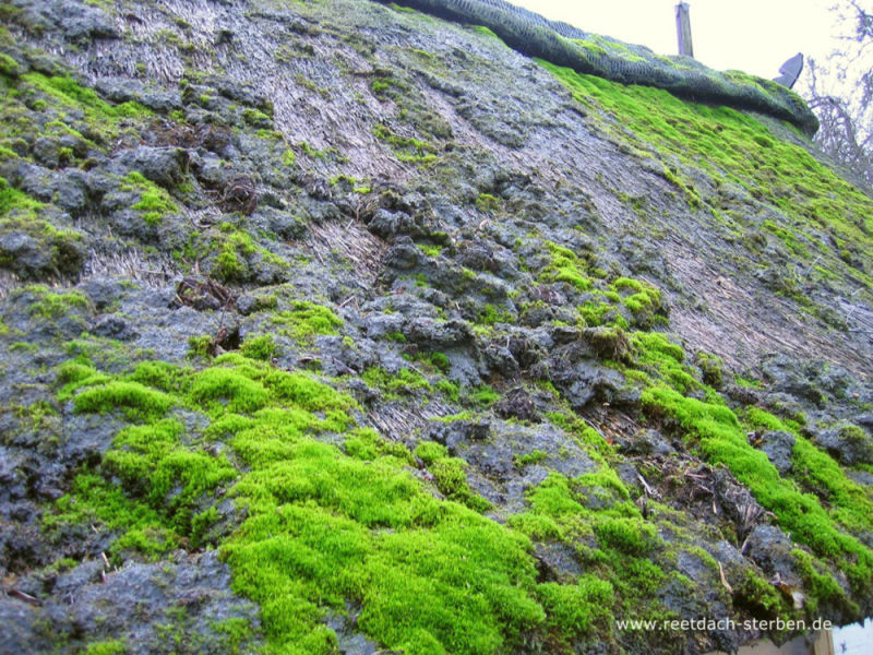 Schleim-/Glibberdach, weißes Pilzmyzel, extremes Mooswachstum, Reet-"Häcksel", Dellen im Dach, Reet löst sich flächig, Reetkompost wie nasses Tempotaschentuch, Reet kann von Hand zu Staub verrieben werden, Reethalm verliert seine Härte, fauliger Geruch, Moospolster mit anhaftendem Reet fallen herunter und vieles mehr: